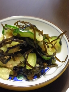 ナスとキュウリと塩昆布の梅酢和え ヨコワの刺身 ぶつぶつもぐもぐ 日々の食生活とか云々